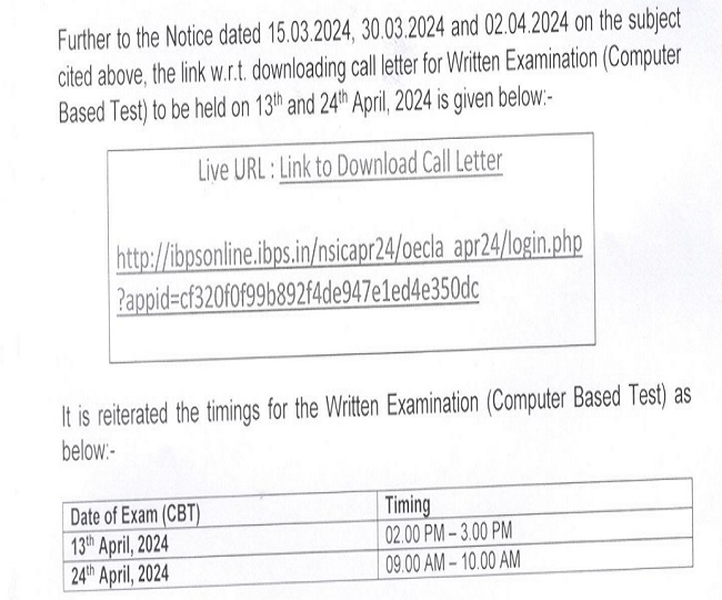 एनएसआईसी की ओर से जारी नोटिफिकेशन के अनुसार भर्ती परीक्षा का आयोजन 13 अप्रैल एवं 24 अप्रैल 2024 को किया जाएगा। परीक्षा का आयोजन निर्धारित परीक्षा केंद्रों पर एक शिफ्ट में करवाया जाएगा। 13 अप्रैल वाली परीक्षा दोपहर 2 बजे से लेकर 3 बजे तक एवं 24 अप्रैल को होने वाली परीक्षा सुबह 9 बजे से लेकर 10 बजे तक आयोजित की जाएगी।