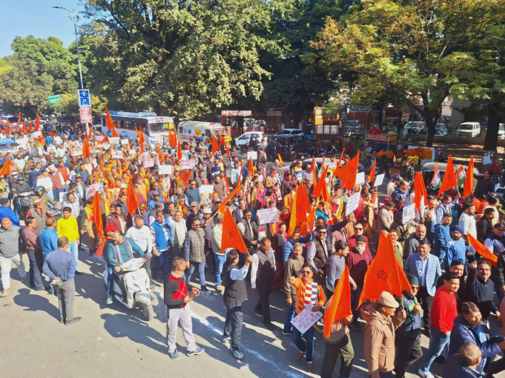 स्वदेशी टाइम्स, हल्द्वानी: बांग्लादेश में हिंदुओं पर हो रहे अत्याचार के खिलाफ कुमाऊं के प्रवेश द्वार हल्द्वानी में भारी आक्रोश देखने को मिला। जहां हल्द्वानी की सड़कों पर विभिन्न धर्म और संगठनों के हजारों लोग इकट्ठा हुए। जिन्होंने हिंदुओं पर हो रहे अत्याचार को लेकर केंद्र सरकार से कार्रवाई की मांग की है। वहीं भाजपा ने भी आक्रोश रैली को अपना पूरा समर्थन दिया। आक्रोश रैली में एक रहोगे सेफ रहोगे का नारा भी दिया। प्रदर्शन में हिंदू संगठनों ने बांग्लादेश में हिंदू, बौद्ध और ईसाई समुदायों के खिलाफ हो रहे हमलों, जबरन धर्मांतरण, सांस्कृतिक धरोहरों के विनाश और धार्मिक स्थलों पर बढ़ती हिंसा पर गहरी चिंता जताई। हल्द्वानी में प्रदर्शनकारियों ने राष्ट्रपति के नाम कुमाऊं कमिश्नर दीपक रावत के माध्यम से ज्ञापन सौंपा।