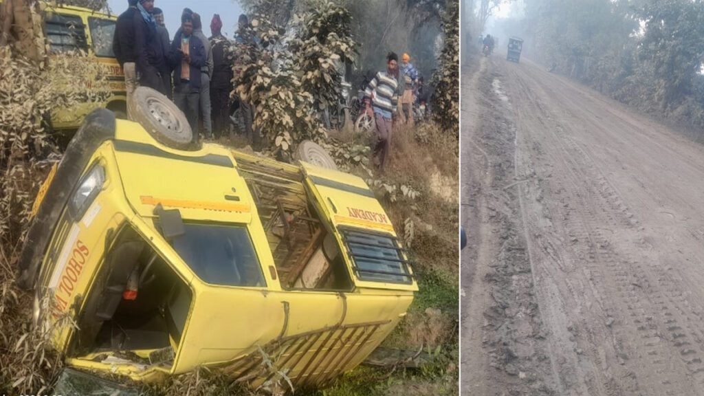 स्वदेशी टाइम्स, मीरगंज: तहसील क्षेत्र के सिधौली-सैजना मार्ग पर भट्टे के सामने मंगलवार सुबह स्कूली वैन बेकाबू होकर पलट गई। हादसे की वजह सड़क पर फैली मिट्टी बताई जा रही है, जिसकी वजह से पहले स्कूली वैन फिसली और फिर पलट गई। वैन में करीब सात बच्चे सवार थे। हादसे में बच्चे मामूली रूप से घायल हुए हैं।