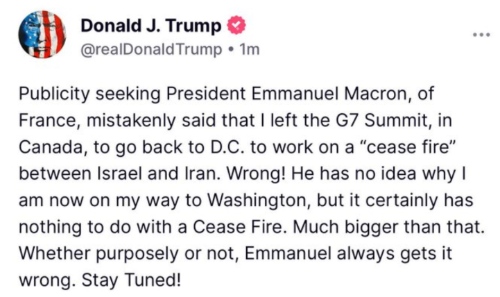 स्वदेशी टाइम्स, वॉशिंगटनः अमेरिका के राष्ट्रपति डोनाल्ड ट्रंप ने जी-7 शिखर सम्मेलन छोड़ने की खबरों के बीच एक महत्वपूर्ण बयान जारी किया है। उन्होंने अपने सोशल मीडिया मंच ट्रुथ सोशल पर एक पोस्ट में कहा, “फ्रांस के राष्ट्रपति इमैनुएल मैक्रों ख्याति प्राप्त करने की कोशिश कर रहे हैं। उन्होंने गलत दावा किया कि मैं कनाडा में हो रहे जी-7 शिखर सम्मेलन से इजरायल और ईरान के बीच ‘युद्धविराम’ पर काम करने के लिए वॉशिंगटन डी.सी. लौट रहा हूं। यह पूरी तरह गलत है! उन्हें बिल्कुल नहीं पता कि मैं वॉशिंगटन क्यों जा रहा हूं, और इसका युद्धविराम से कोई संबंध नहीं है। यह उससे कहीं बड़ा मुद्दा है। चाहे जानबूझकर हो या अनजाने में, इमैनुएल हमेशा गलत समझते हैं।”