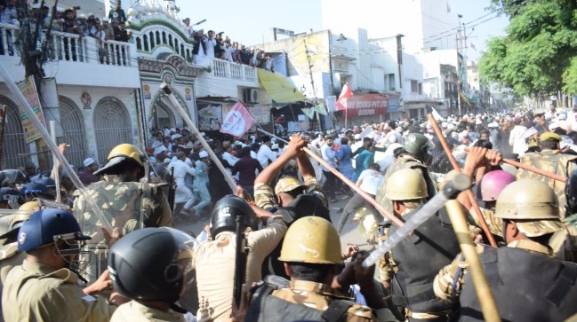 इनमें कुछ के हाथ में पत्थर तो कुछ के हाथ में आई लव मोहम्मद लिखी तख्यियां थीं। इन्होंने एसपी सिटी को निशाना बनाकर पत्थर फेंकने शुरू किए तो पुलिस ने उन्हें सुरक्षा घेरे में ले लिया। फिर पुलिस ने आंसू गैस के गोले दागे। इससे भगदड़ मची। साथ ही, लाठीचार्ज करके पुलिस ने रास्ता खाली करा दिया।