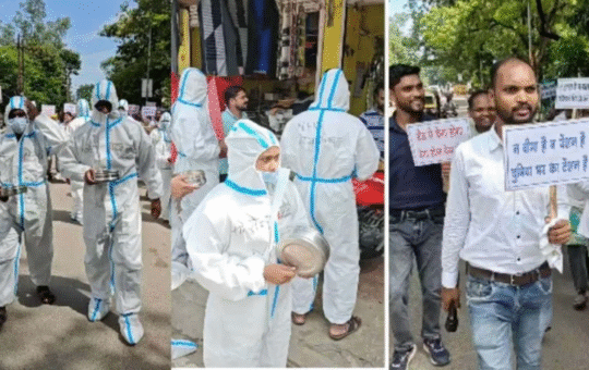 छत्तीसगढ़: NHM कर्मियों का अनोखा विरोध: मांगों के समर्थन में PPE किट पहनकर भीख मांगते दिखे