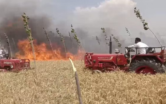 स्वदेशी टाइम्स : तेज हवा के चलते गेहूं के खेत के ऊपर से गुजर रही 11 केवी की लाइन में...